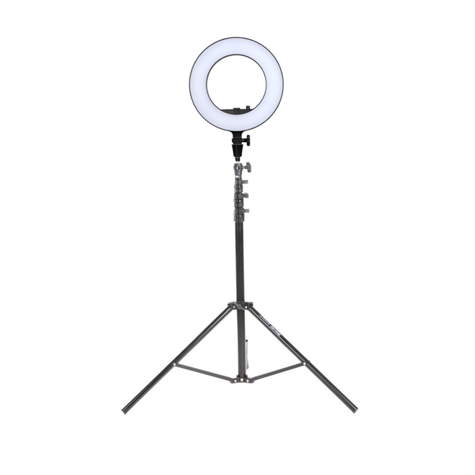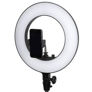 En ringlampa ger ett karakteristiskt, skuggfritt ljus och en snygg rund ”catchlight” (blänk i ögonen). Tack vare lampans utformning fotograferar du genom lampan, vilket gör det mycket enkelt att få till ett snyggt ljus. Du riktar helt enkelt lampan mot dig själv, eller mot den du vill fota eller filma, och därefter justerar du enkelt ljusstyrkan tills du är nöjd.Denna ringlampa passar utmärkt för mobiler då det ingår en hållare för din mobiltelefon, men det går givetvis utmärkt att använda en vanlig kamera för att fotografera eller filma med lampan. Då behöver du bara ställa den på ett stativ eller själv hålla i kameran. Glöm inte att även införskaffa ett belysningstativ för att kunna montera ringlampan.