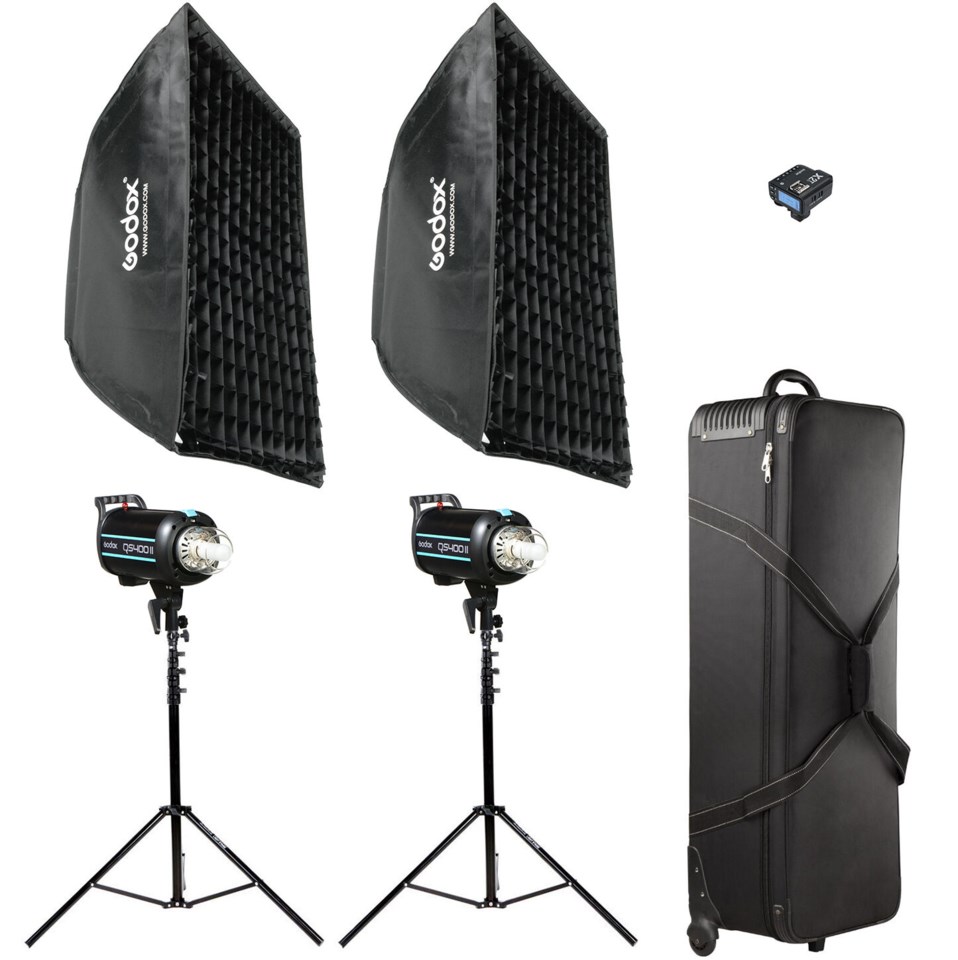 Detta paketet innehåller två studioblixtar med stabila belysningsstativ, rymlig väska och en bra blixtsändare. Med detta paketet kommer du snabbt igång med studiofotografering. Godox QS400II är en ytterst prisvärd och kompakt studioblix med ett kraftfullt inställningsljus, vilket underlättar både för fotograf och modell.