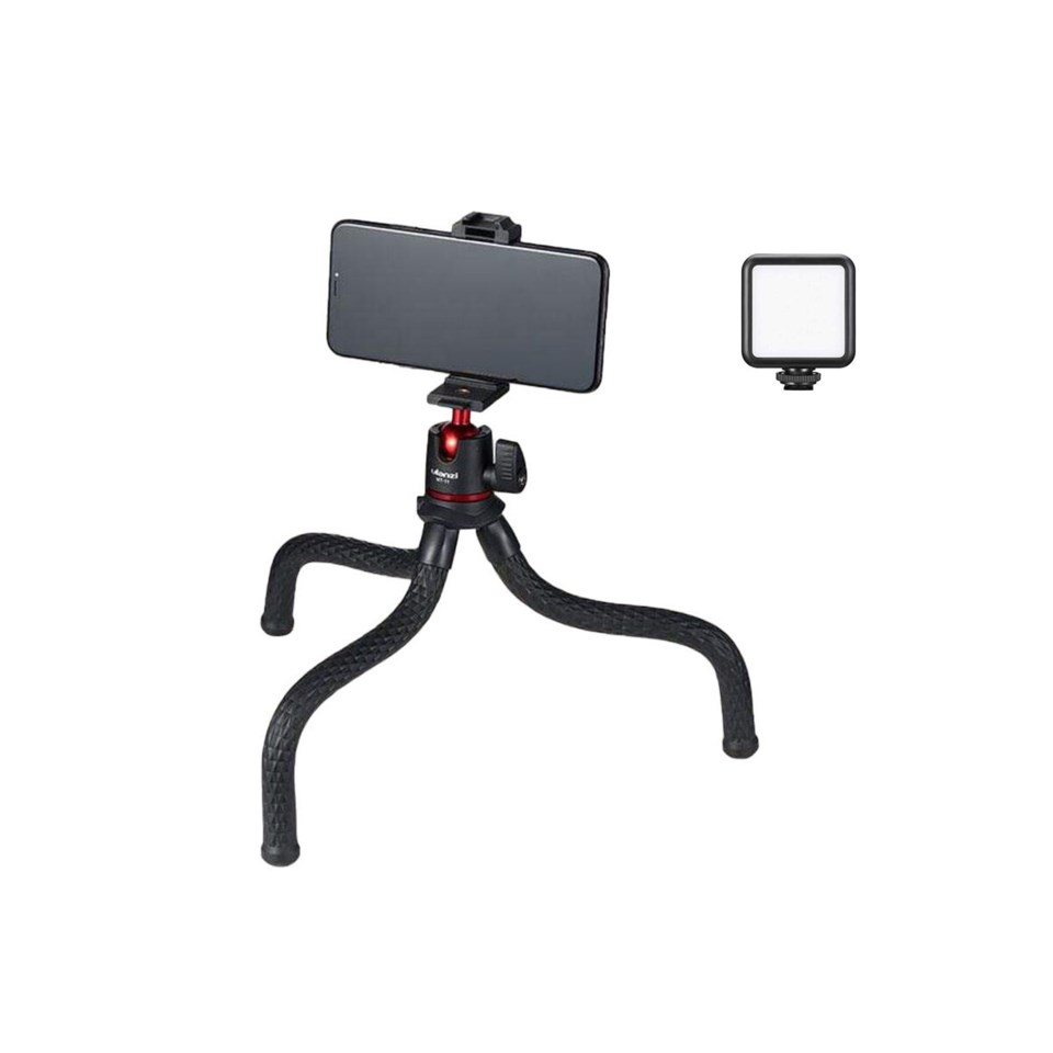 Du får med det multifunktionella stativet MT-11, som du kan i princip var som helst. Tack vare dess böjbara ben går det vira fast på och runt de flesta objekt eller helt enkelt ställa det på ditt skrivbord. Fördelen med detta stativet är att det ha en, 2-i-1-design, vilket innebär att du kan använda det både till din mobil och vanliga mindre kamera. Stativet är smidigt och enkelt att använda, det finns ett kulhuvud som gör att du kan vinkla din mobil eller kamera för att få den perfekta vinkeln.Belysning som ryms i fickan – för mobil och kamera